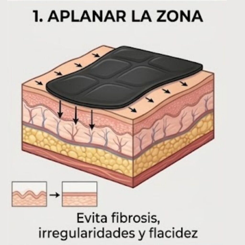 - Aplanar la zona: Mantiene una presión uniforme que ayuda a evitar la fibrosis o irregularidades en la piel.